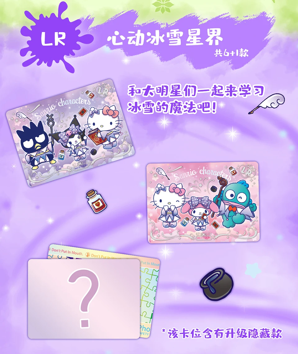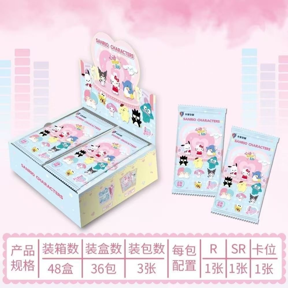 A: This wave of Sanrio anime character wink cards prominently features Hello Kitty, My Melody, Kuromi, Cinnamoroll, Pompompurin, Keroppi, and Badtz-Maru.