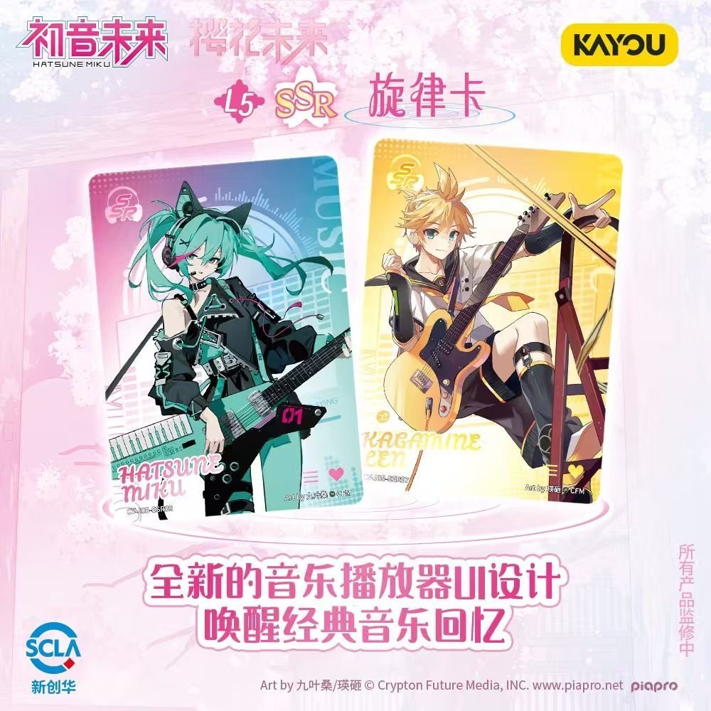 The KAYOU Hatsune Miku Cherry Blossom Poetry set is distinguished by its soft, pastel color palette and intricate nature-inspired backgrounds.