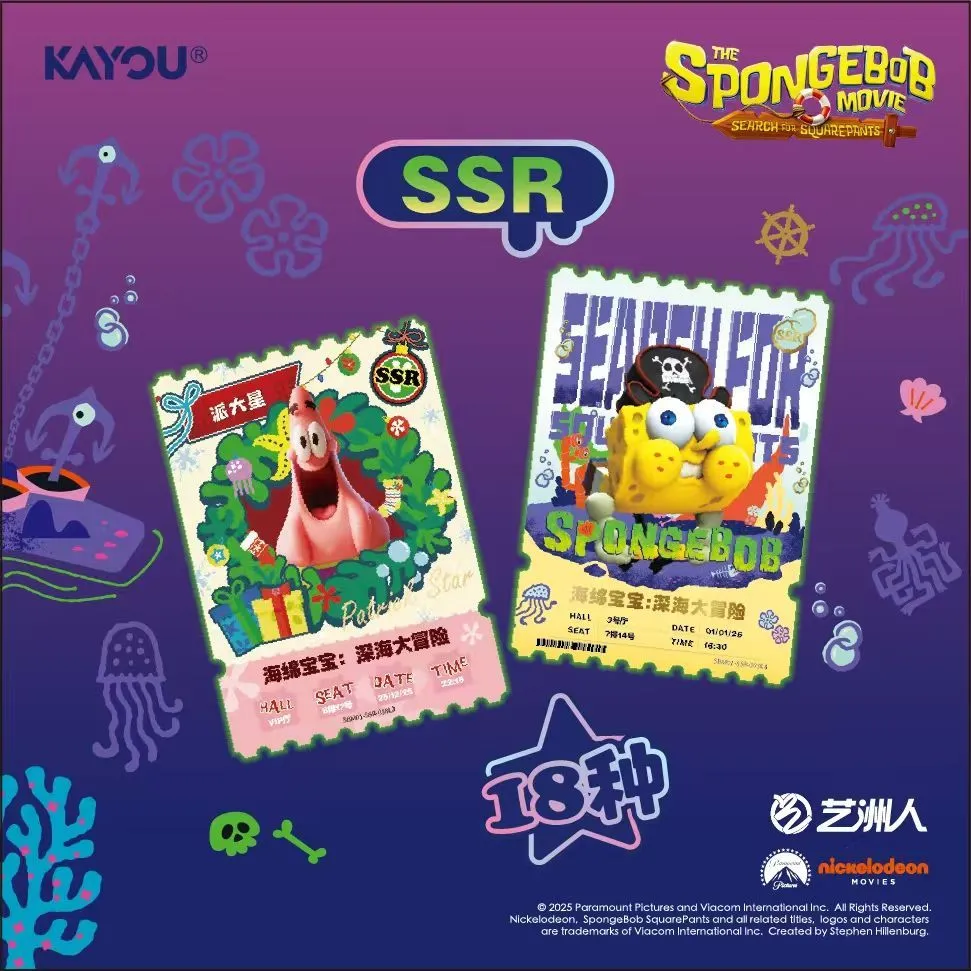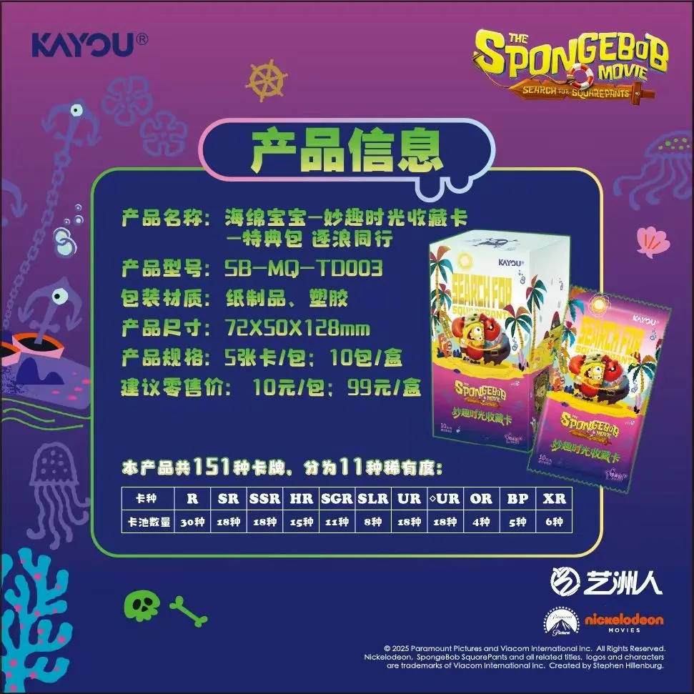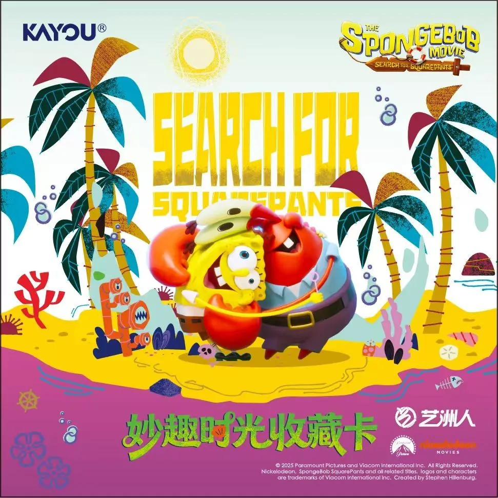 Bikini Bottom High-Fidelity Adventure The KAYOU SpongeBob cards “Fun Time Chasing The Waves Together” (妙趣时光-浪遏飞舟) collection brings the colorful energy of the ocean to life with high-fidelity artistry. This set captures iconic moments from The SpongeBob Movie, featuring SpongeBob, Mr. Krabs, and the gang in vibrant, sun-soaked beach scenes rendered on premium card stock.