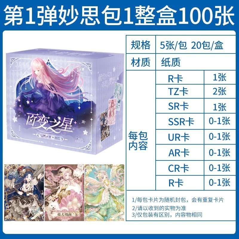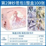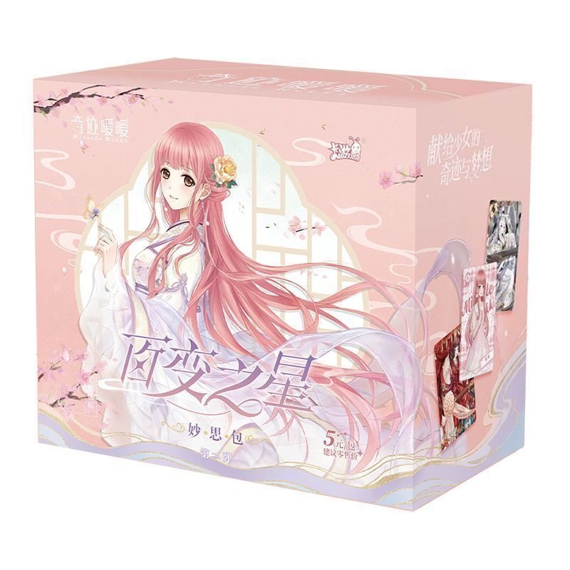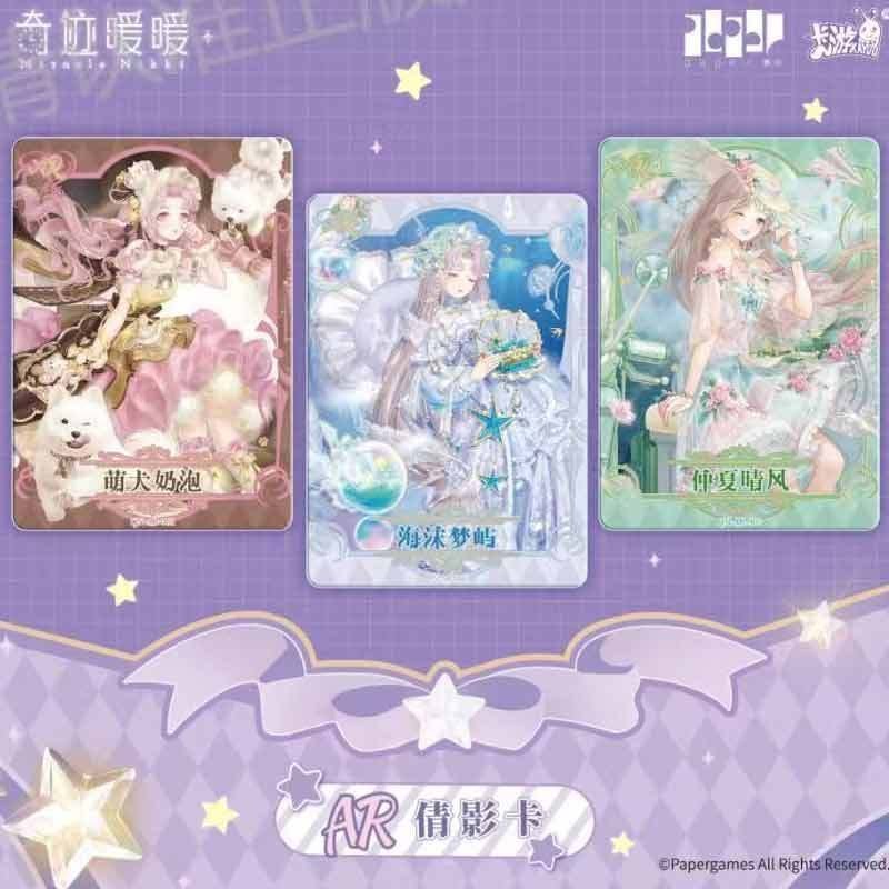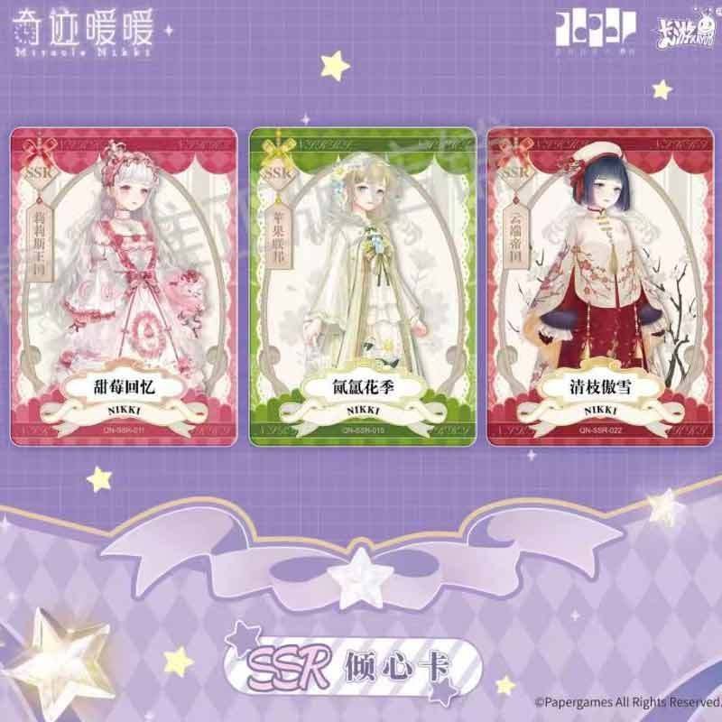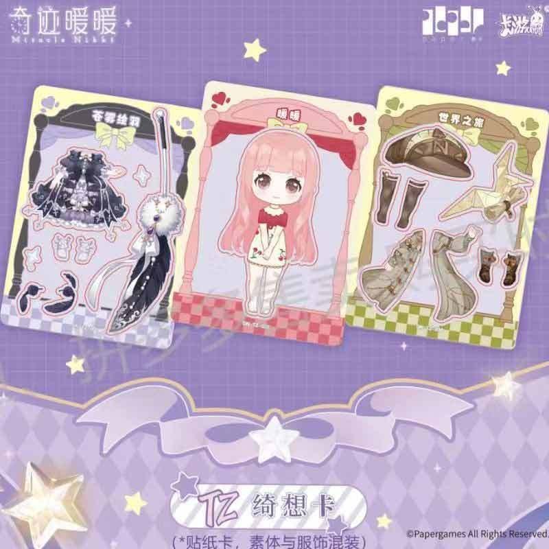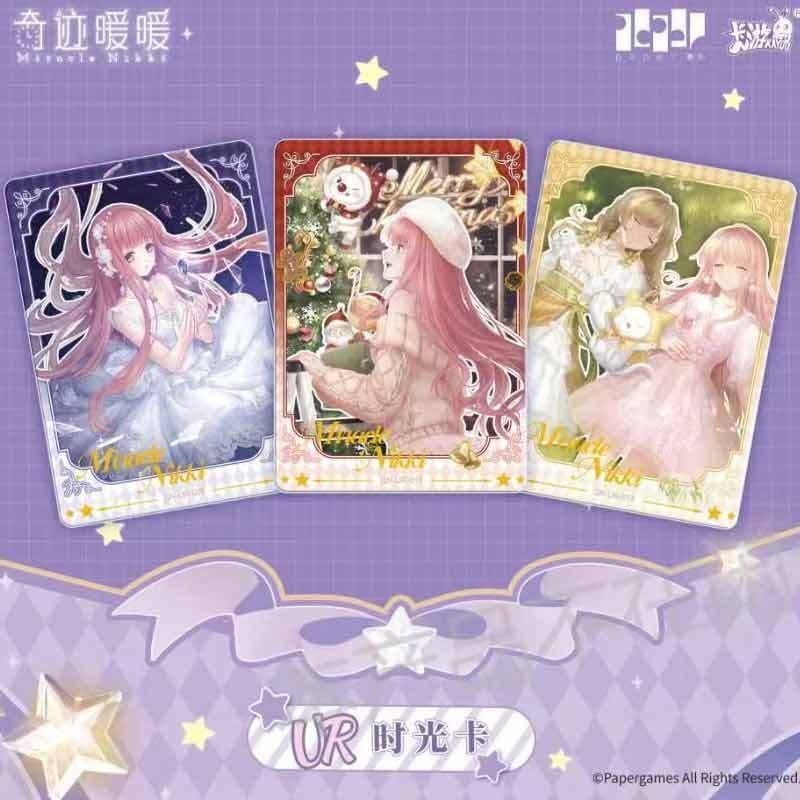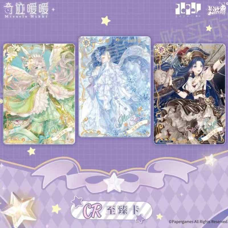 The Miracle Nikki Wonderful Thoughts Pack is distinguished by its deep purple, celestial-themed packaging, featuring Nikki in a breathtaking starlight gown. These Miracle Nikki anime girl cards utilize advanced printing technologies, including multi-stage holographic foiling and diamond-dust textures, to replicate the shimmering fabrics and intricate lace of the in-game outfits.